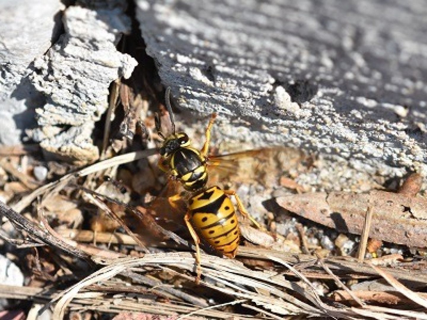 Yellow jackets are house fly-sized wasps with distinct yellow and black markings and a few hairs. They construct a similar type of paper nest; however, it will be tan in color, much smaller in size compared to the hornet nest, and is usually found in an underground cavity. Common locations for nests are in lawns, particularly in sandy exposed areas, as well as at the base of trees or shrubs. Occasionally, yellow jackets will nest in attics or wall voids of houses or storage buildings.