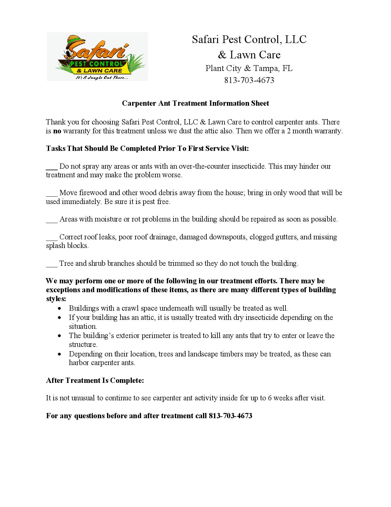 Call the best, Safari Pest Control, in the Brandon and Plant City area to perform a thorough inspection, locate the nest and destroy the pest. We use the most effective and safe chemicals to remove these pests. With a combination of baiting and spraying we can eliminate the Carpenter Ant, guaranteed! We have the best indoor / outdoor treatment program, creating a barrier on the perimeter, around windows, doors, cracks and crevices where the pest may try to enter. Our inside treatment will kill the ants that make it in. Our products are the best on the market. The ants walk through the product and carry it back to the nest where they groom each other killing all they come in contact with.